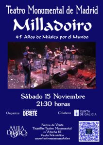El próximo sábado 15 de noviembre de 2025, el Teatro Monumental de Madrid acogerá un concierto muy especial del legendario grupo Milladoiro, una de las formaciones más emblemáticas del folk gallego y de la música celta europea. Bajo el título “45 Años de Música por el Mundo”, la banda ofrecerá una actuación que repasará las principales etapas de su extensa trayectoria, combinando emoción, virtuosismo y un sonido que ha marcado generaciones.
