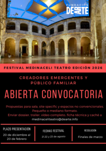 La Fundación DEARTE y el Festival Medinaceli TEATRO lanzan su convocatoria PROPUESTAS DE TEATRO para formar parte de su VII Edición. En línea con ediciones anteriores, este año el festival mantiene su apuesta por propuestas de teatro contemporáneo basadas en clásicos universales, presentadas por compañías emergentes y compañías especializadas en teatro familiar.